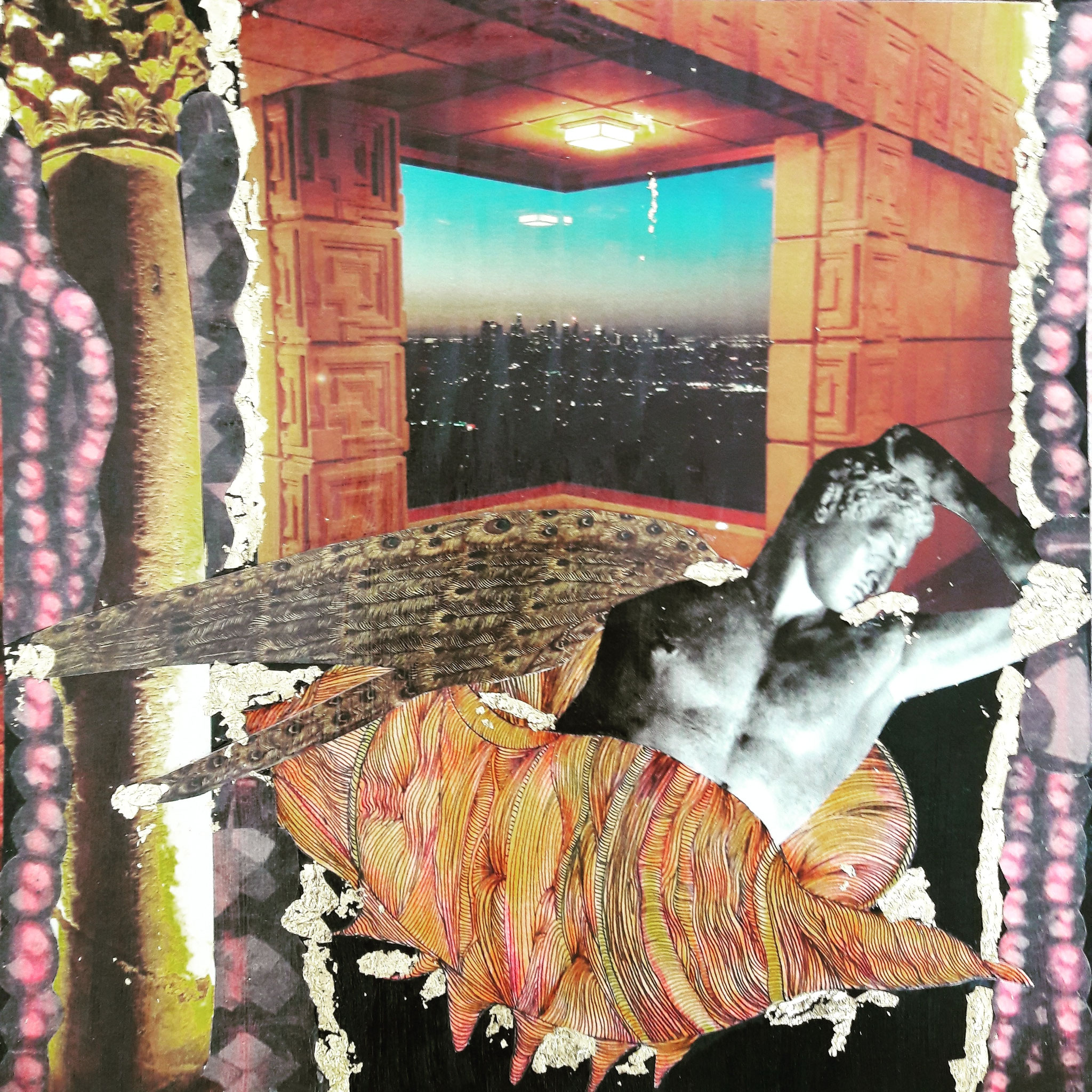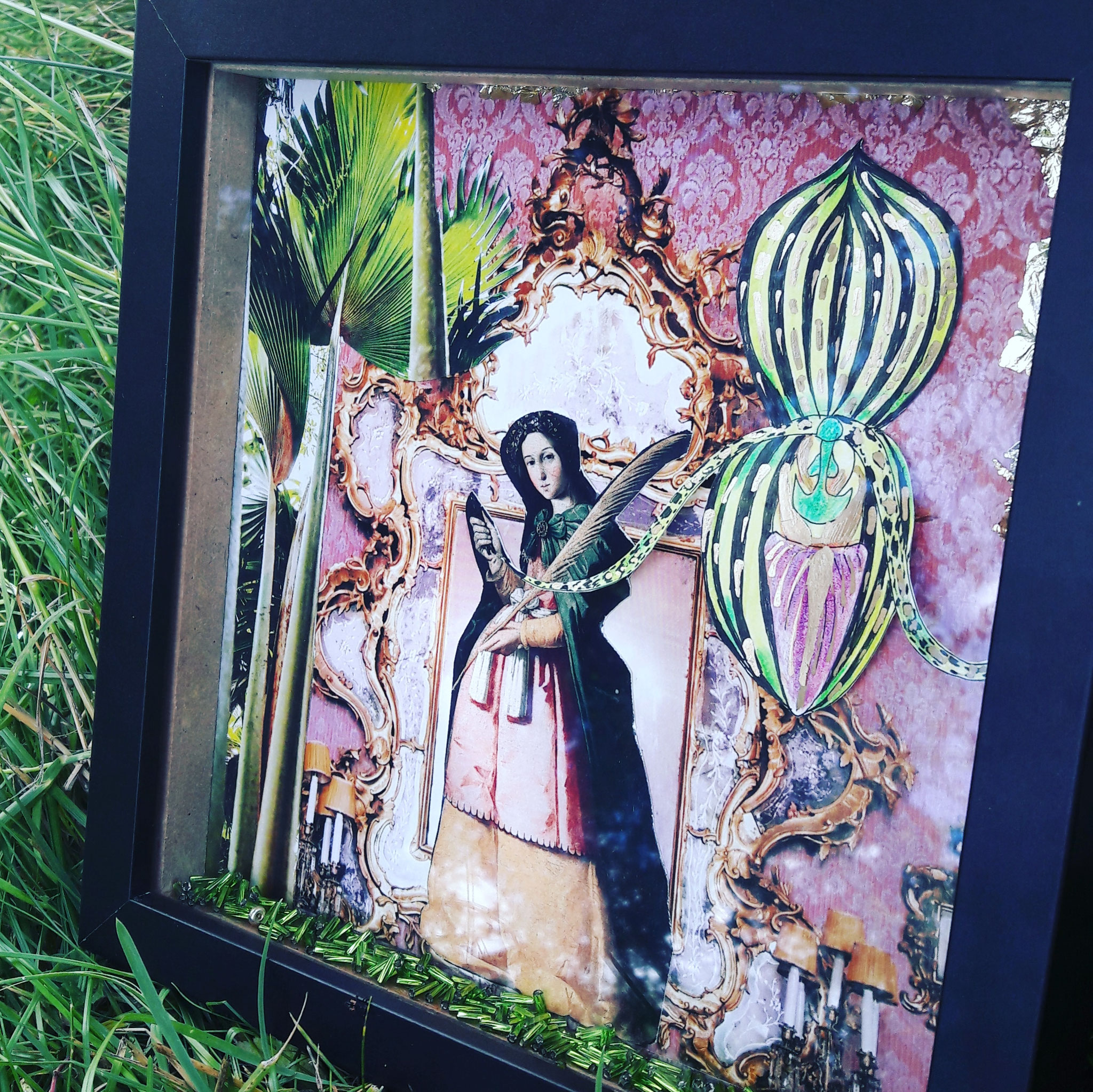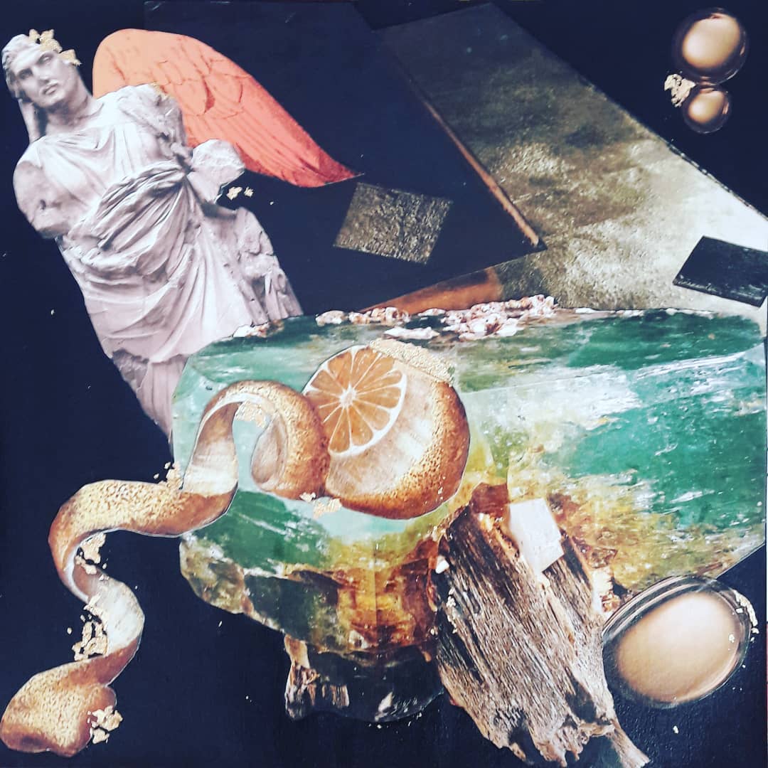 Ces collages, présentés dans des cadres-boîtes noirs (20x20x5 cm), se présentent comme des petits univers dans des théâtres miniatures. Ils sont composés de photos, de dessins et de feuilles d'or. D'autres collages sont effectués sur des toiles de différents formats.