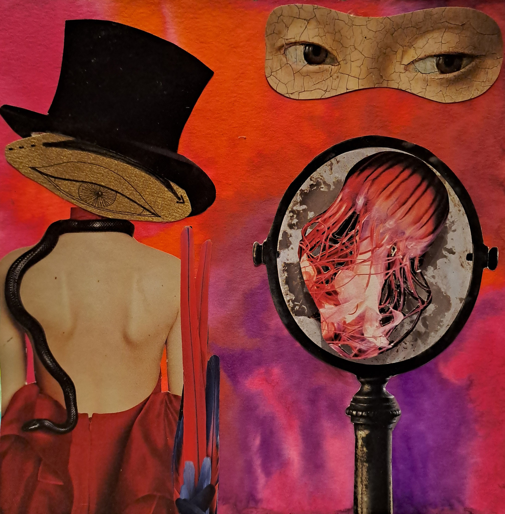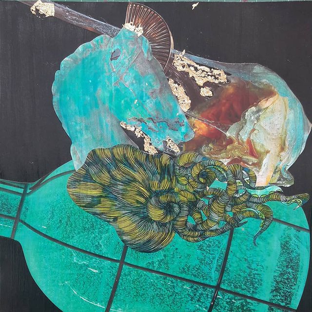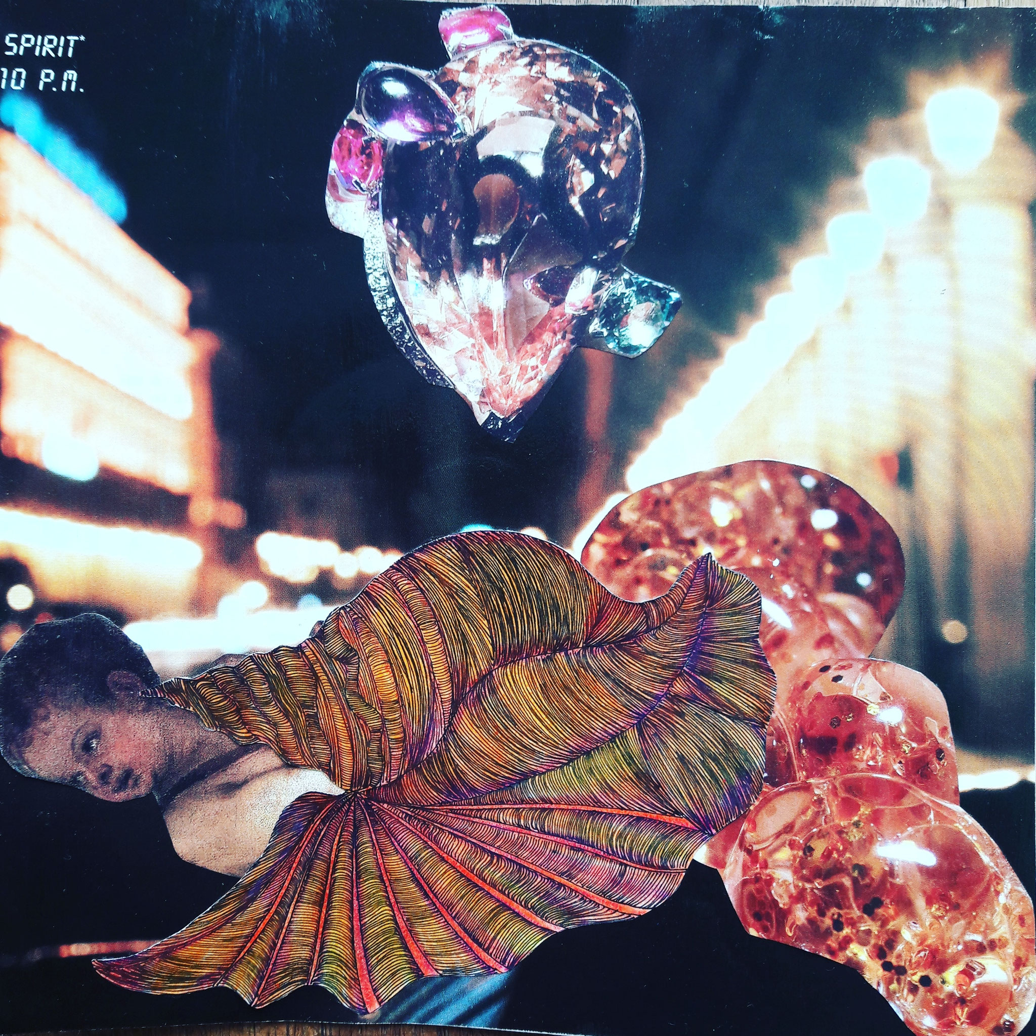 Ces collages, présentés dans des cadres-boîtes noirs (20x20x5 cm), se présentent comme des petits univers dans des théâtres miniatures. Ils sont composés de photos, de dessins et de feuilles d'or. D'autres collages sont effectués sur des toiles de différents formats.