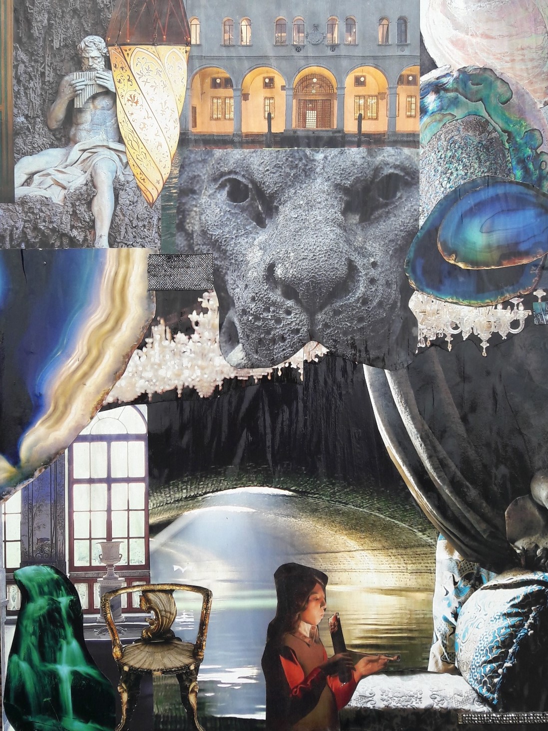 These collages, presented in black box-frames (20x20x5 cm,) appear as small universes in miniature theaters. They are composed of photos, drawings and gold leaves. Other collages are made on canvases off different sizes.